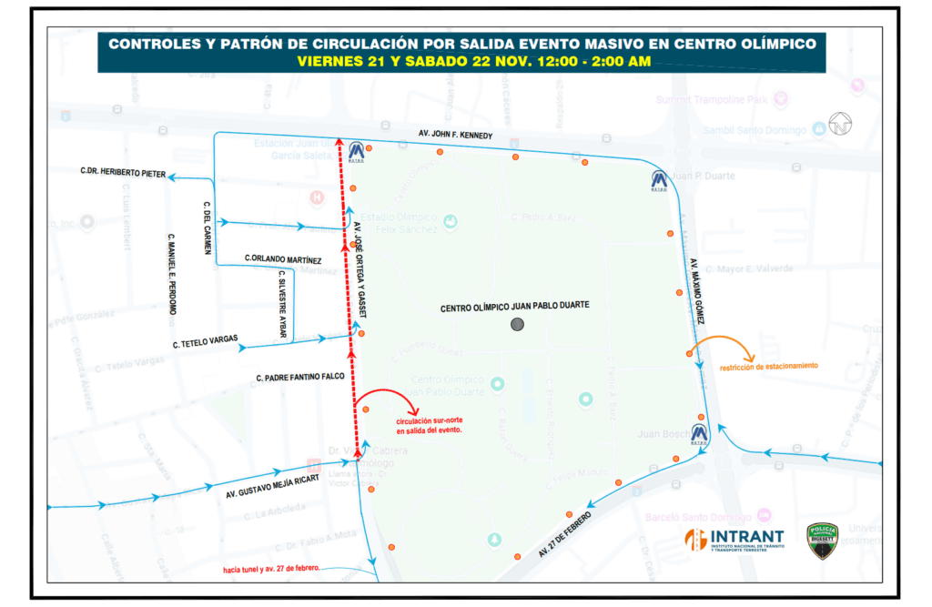 La Dirección General de Seguridad de Tránsito y Transporte Terrestre (DIGESETT), el Instituto Nacional de Tránsito y Transporte Terrestre (INTRANT) y el Gabinete de Transporte informan a la ciudadanía que, con motivo del concierto del artista Bad Bunny, que se realizará durante dos días en el Centro Olímpico Juan Pablo Duarte, se ejecutará un amplio operativo de gestión vial para garantizar la seguridad y la movilidad en todo el entorno.